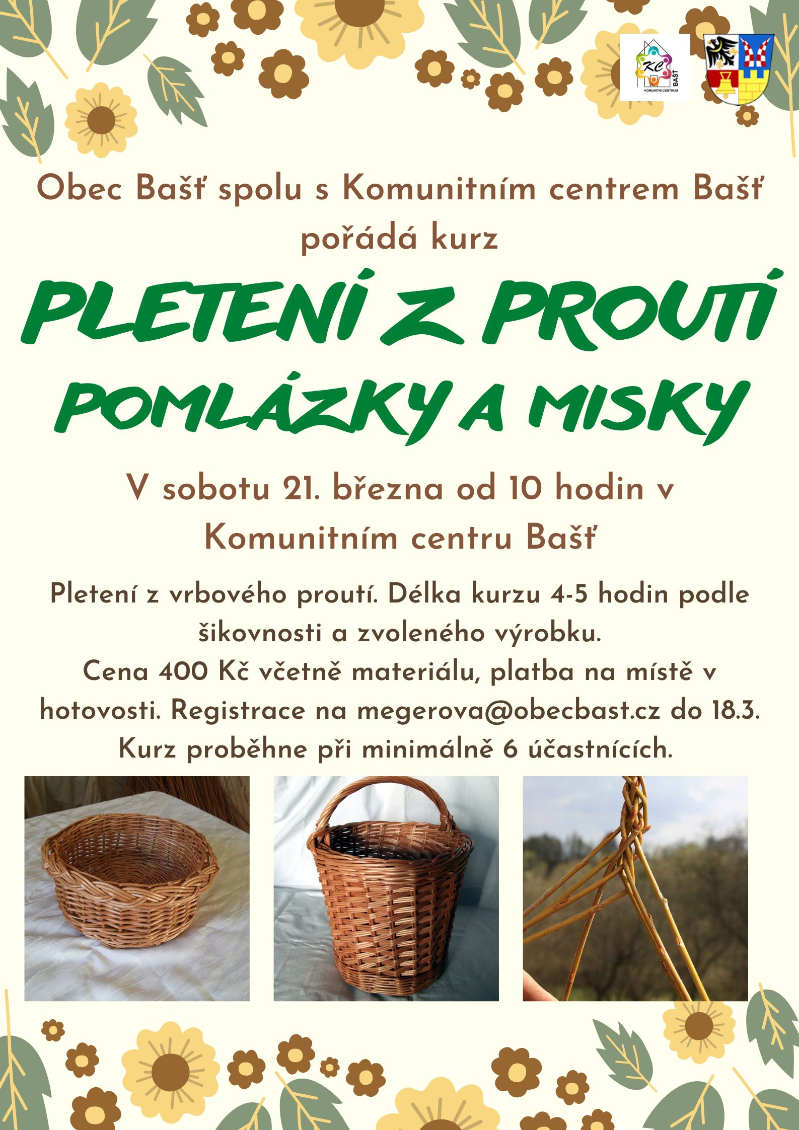Zveme všechny na předvelikonoční pletení pomlázky a misky-ošatky z proutí. 🧺🐣Hezkou misku na vajíčka 🪺a pro koledníky potřebnou pomlázku si můžete přijít uplést do Komunitního centra Bašť v sobotu 21. března od 10 hodin. Kurz bude trvat 4 až 5 hodin, délka je závislá na šikovnosti účastníků. Registrace předem je nutná na megerova@obecbast.cz do 18. […]