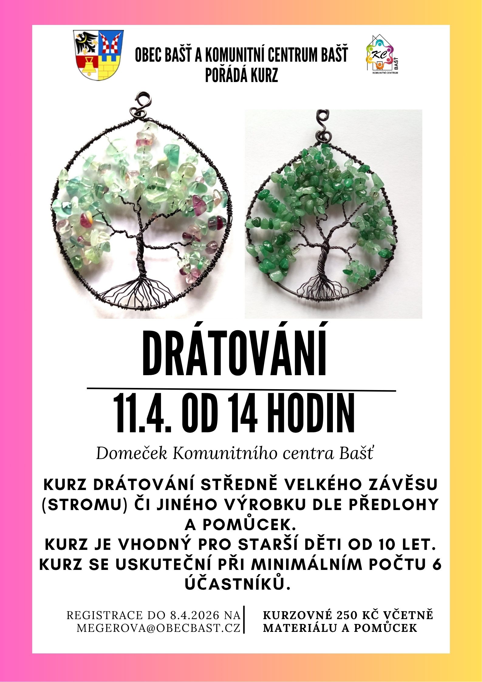 Přijďte si vyzkoušet kreativní techniku drátování a vytvořit si vlastní dekoraci – středně velký závěs (strom) nebo jiný výrobek dle předlohy a dostupných pomůcek. 📆 V sobotu 11.4. od 14 hodin v Domečku Komunitního centra Bašť 🧒 Kurz je vhodný pro starší děti od 10 let 👥 Minimální počet účastníků: 6 💰 Kurzovné: 250 Kč […]