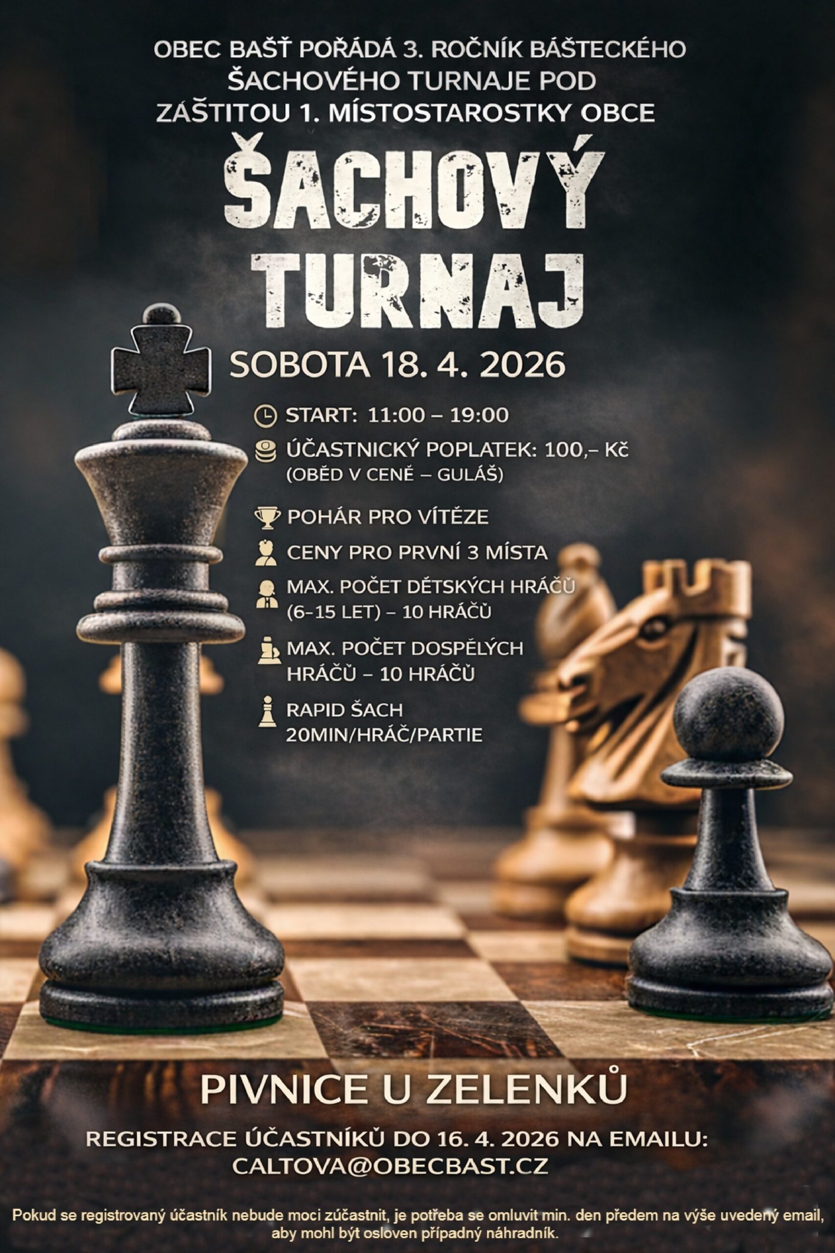 Obec Bašť vás zve na 3. ročník Baštěckého šachového turnaje, který se uskuteční v sobotu 18. 4. 2026 v příjemném prostředí Pivnice U Zelenků. Čeká vás pohodová atmosféra, přátelské souboje na šachovnici i něco dobrého k jídlu – guláš je v ceně startovného 🍲♟️ Turnaj je otevřen dětem i dospělým, počet míst je ale omezený, […]