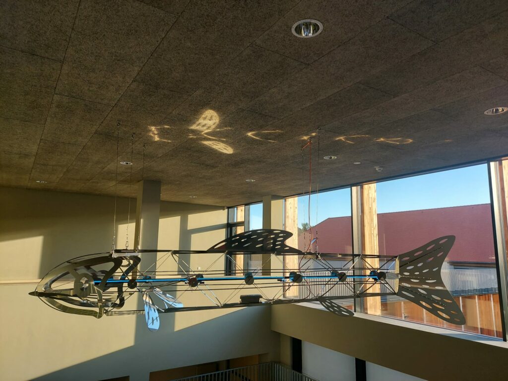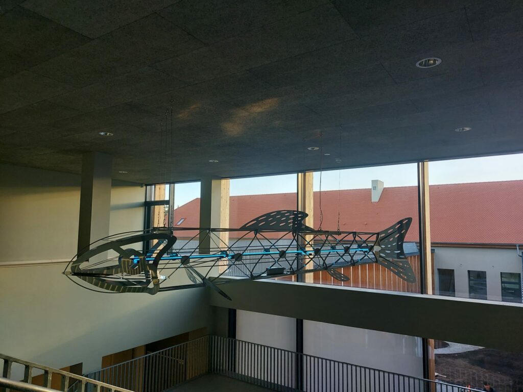 Instalace závěsné ryby, která symbolizuje kreativitu, volnost a pohyb.