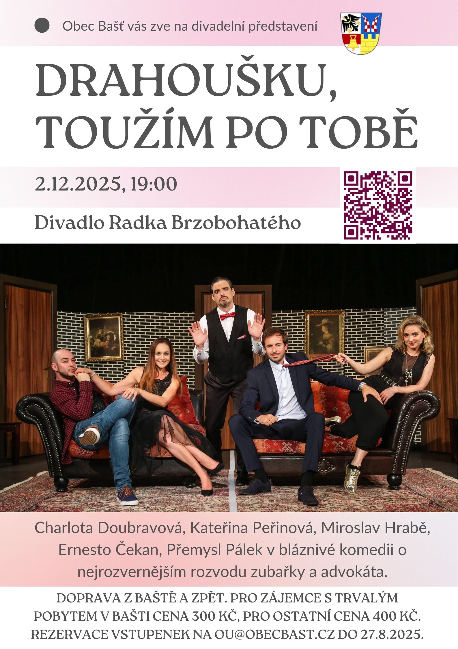 Obec Bašť pořádá zájezd na divadelní představení Drahoušku, toužím po tobě v úterý 2 prosince do Divadla Radka Brzobohatého Rezervace vstupenek do 278 na adrese ou@obecbastcz Cena pro…