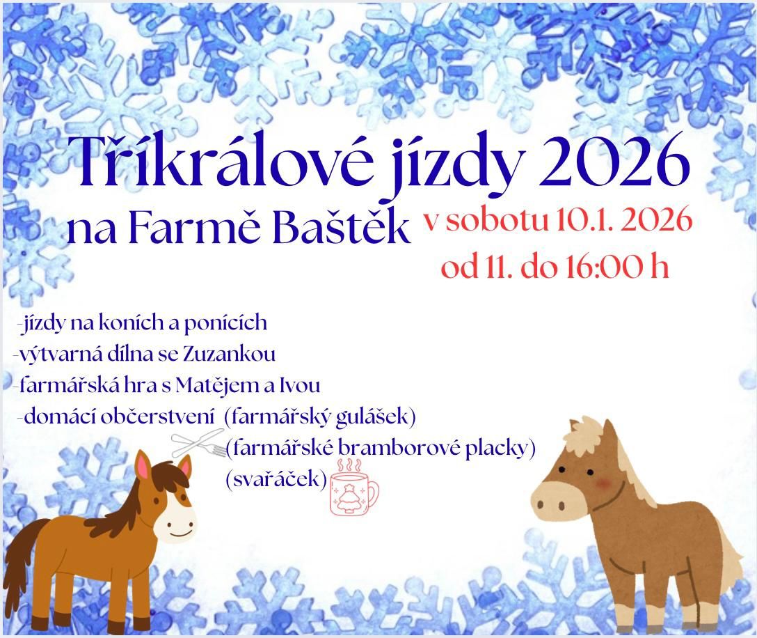 Farma Baštěk Vás srdečně zve na tradiční Tříkrálové jízdy, které se uskuteční10 1 2026 od 11 – 16 hod Přijďte si užít jedinečnou atmosféru lidové tradice a setkání u…