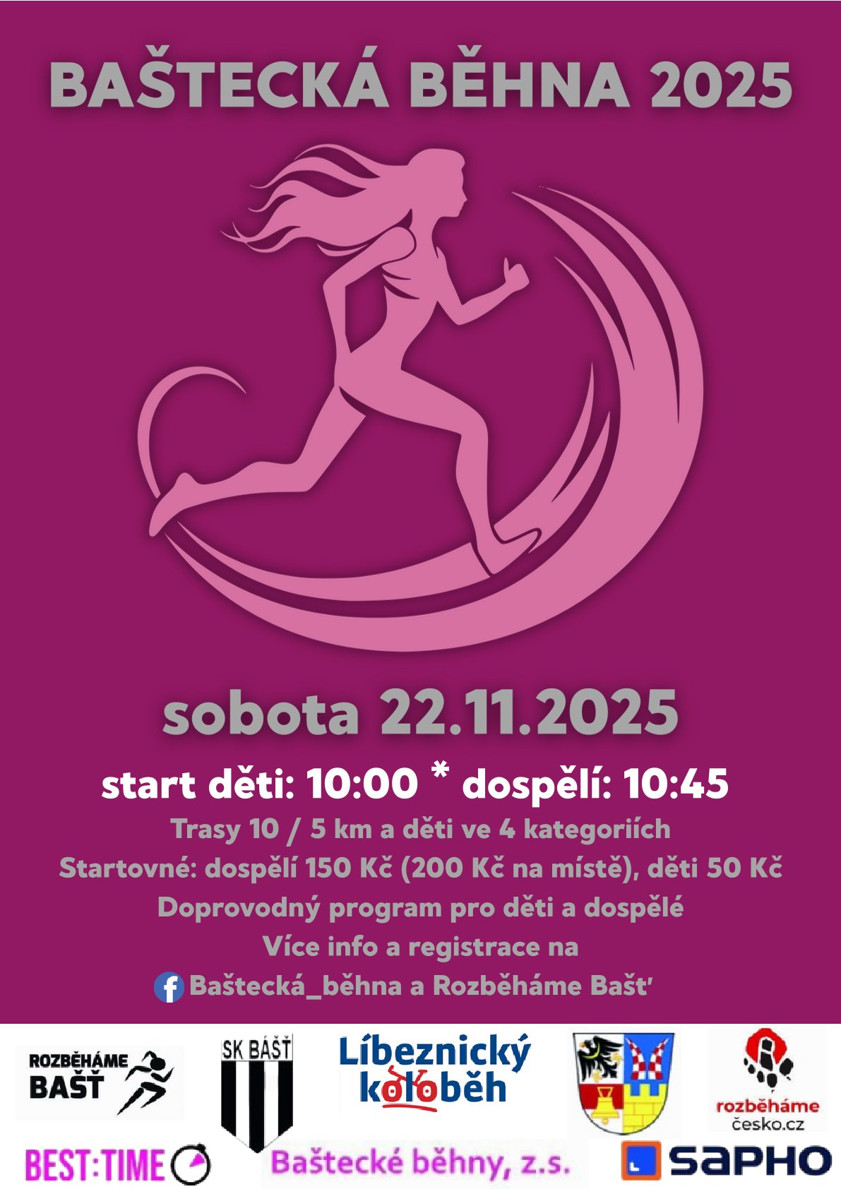 Baštecká běhna 2025 je zpět! Přijďte si v Bašti zaběhat Kdy: 22.11.2025 Start dětí v 10:00 Start dospělých v 10:45 Trasy: 10 km / 5 km + dětské závody ve 4 kategoriích Startovné: • Dospělí 150 Kč (200 Kč na místě) • Děti 50 Kč doprovodný program pro malé i velké Registrace a více info […]
