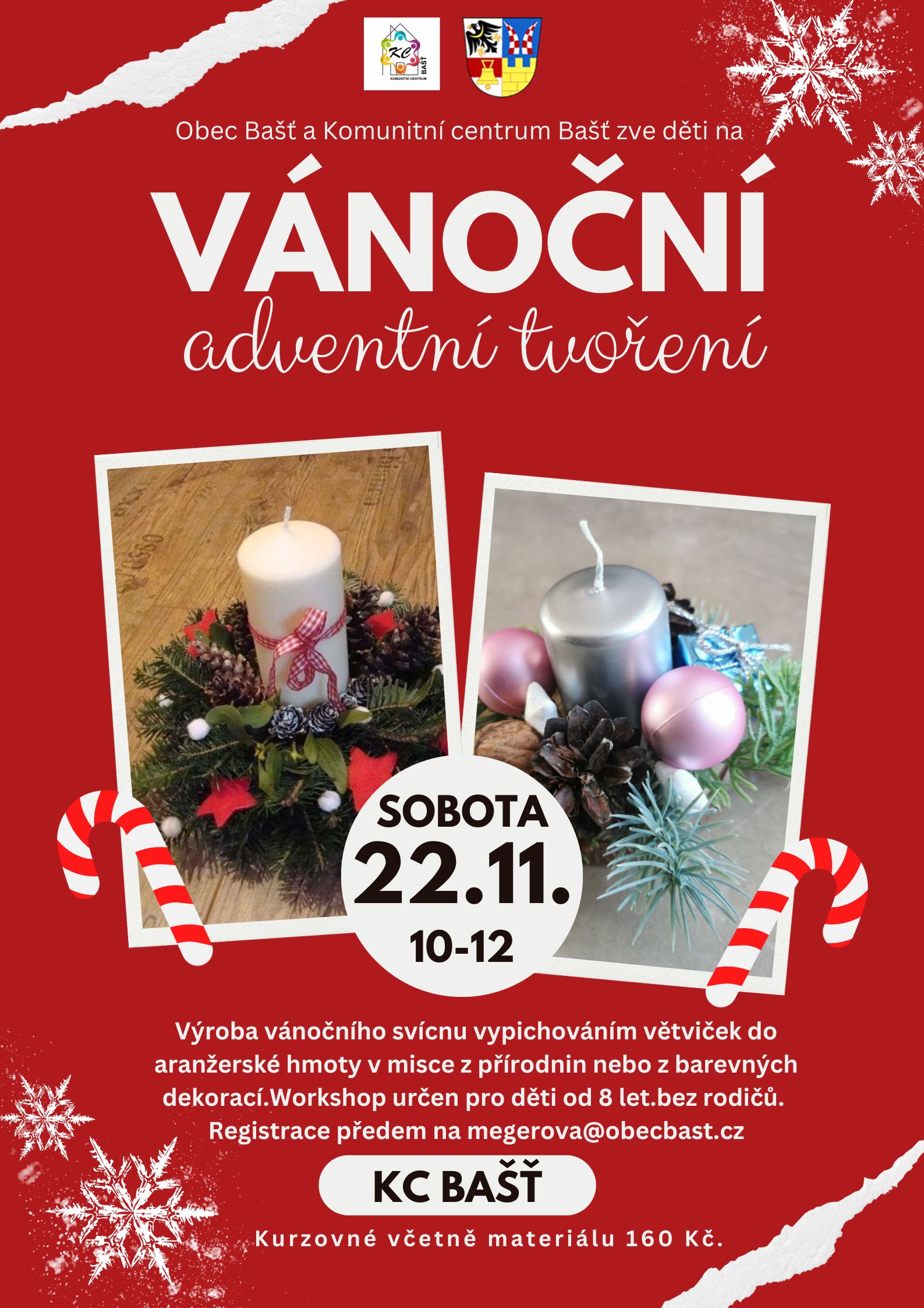 Vánoční tvoření svícnu – jen pro děti! V sobotu 22. 11. 2025 od 10 do 12 hodin v Komunitním centru Bašť. 🤫Pst… rodiče tentokrát zůstávají za dveřmi! 😉 Přijď si k nám vyrobit vlastní vánoční svícen a užít si odpoledne plné třpytek, smíchu a voňavé atmosféry Vánoc. Určeno dětem od 8 let bez doprovodu rodičů. […]