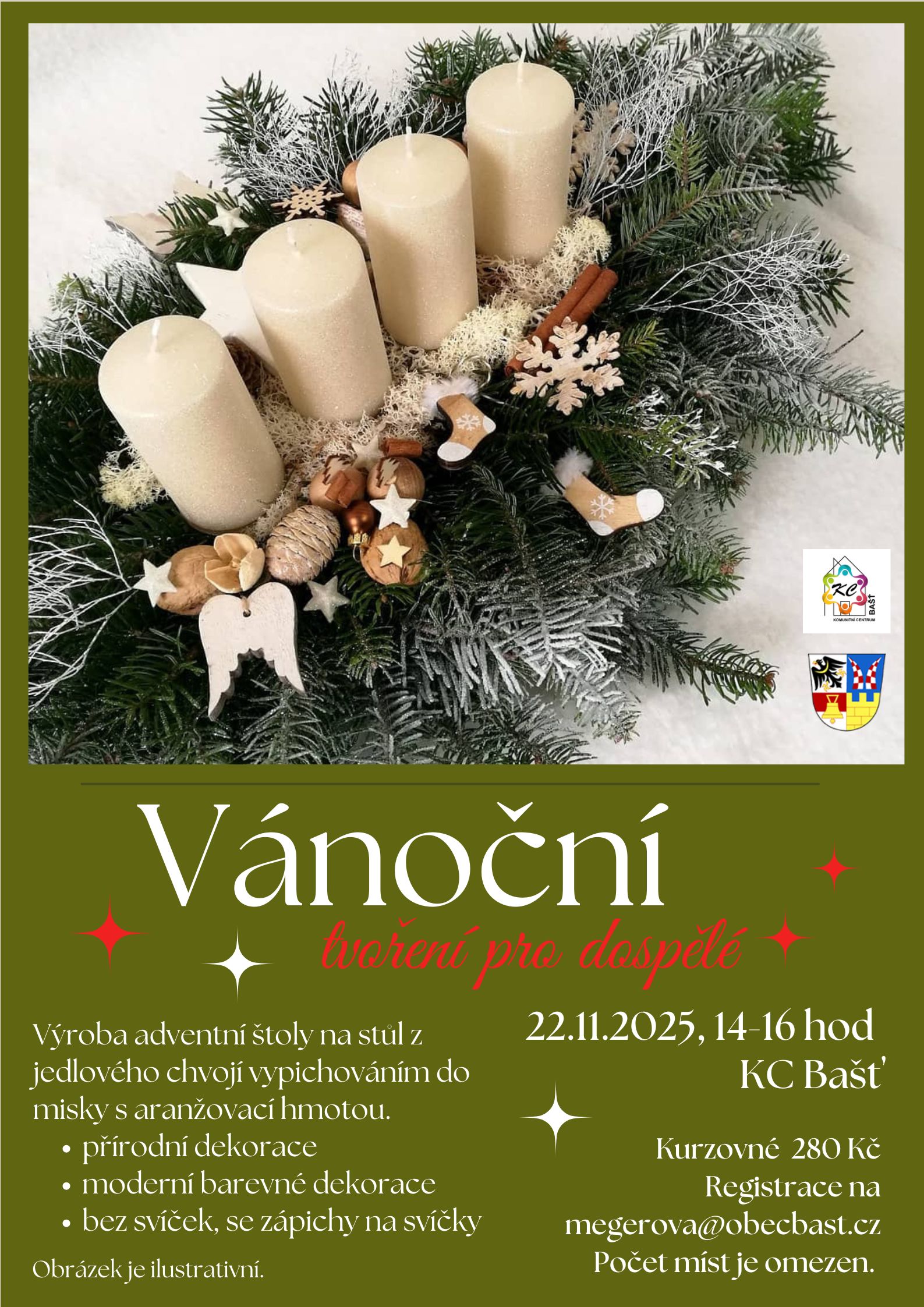 🎄 Vánoční tvoření pro dospělé 🎄 Přijďte si vytvořit krásnou adventní štolou na stůl z jedlového chvojí, která zkrášlí váš domov během vánočních svátků.Budeme aranžovat do misky s aranžovací hmotou a využijeme:✨ přírodní dekorace✨ moderní barevné doplňky✨ materiál kromě svíček a teplý čaj či káva jsou zajištěny. 📅 Kdy: 22. listopadu 2025, 14:00–16:00📍 Kde: KC […]