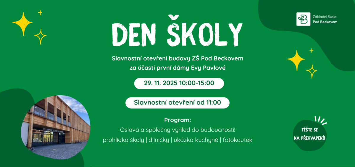 Srdečně vás zveme na slavnostní otevření naší nové školy v sobotu 29. listopadu. Program bude probíhat od 10:00 do 15:00. Slavnostní otevření za účasti první dámy Evy Pavlové je naplánované od 11:00. Celý den budou probíhat i doprovodné aktivity pro děti a těšit se můžete i na malé překvapení. Těšíme se na vás!