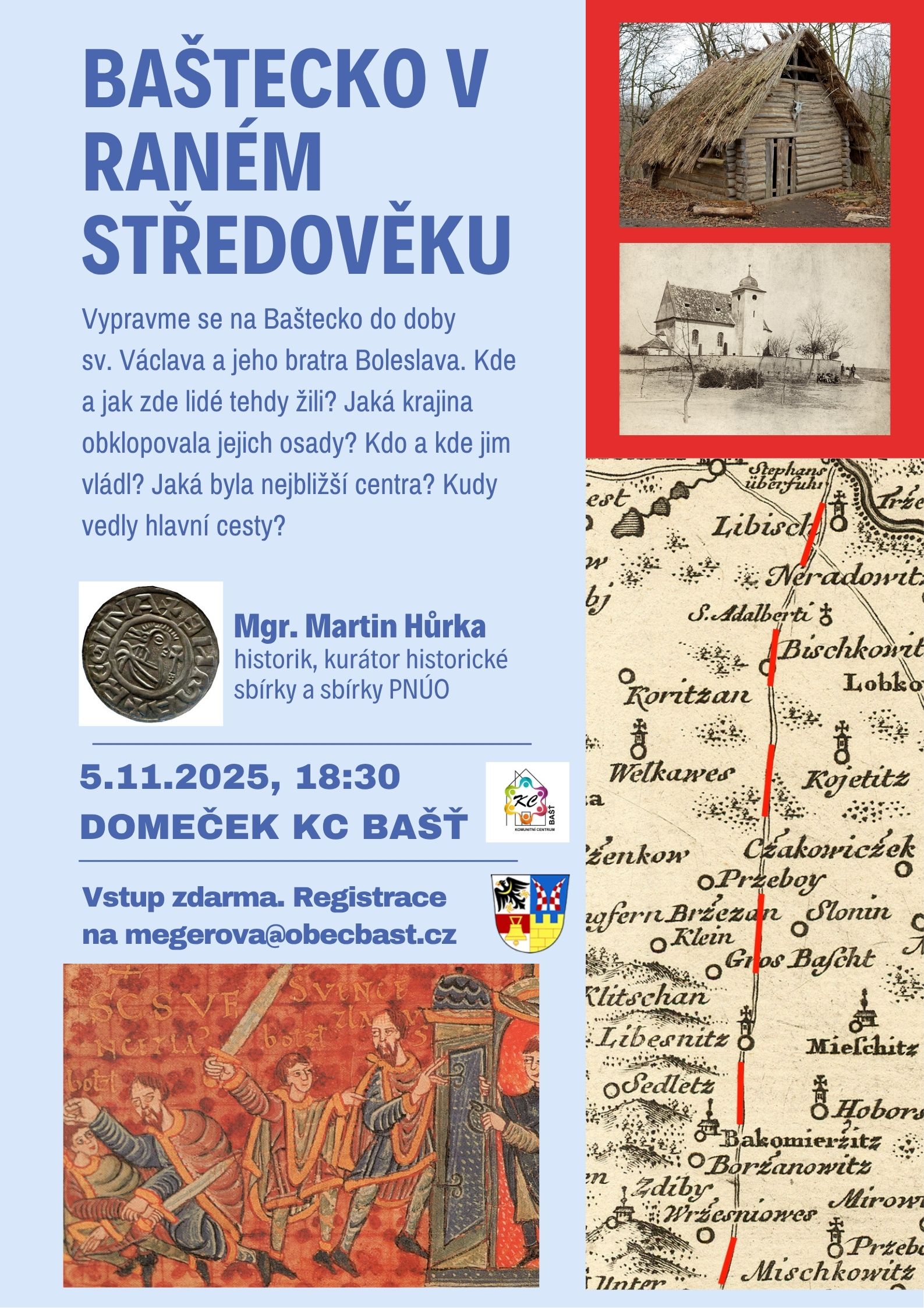 Zveme vás na přednášku ve středu 5. 11. 2025 od 18:30 hod do Domečku Komunitního centra Bašť. Po krátké odmlce přijíždí do Baště historik Martin Hůrka z Oblastního muzea pro Prahu – východ, aby nám vyprávěl o tom, jak to u nás vypadalo v dobách raného středověku. Dozvíme se, kudy vedli hlavní cesty, kde a […]